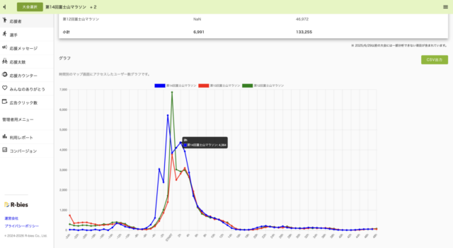 応援naviの様々な利用状況が分析可能。応援太鼓分析等から大会の盛り上がりが可視化され、前年比較もカンタンに表示できます。値はCSVデータ出力も可能です。 ※参考画面は富士山マラソンの3年間のユーザー数グラフです。