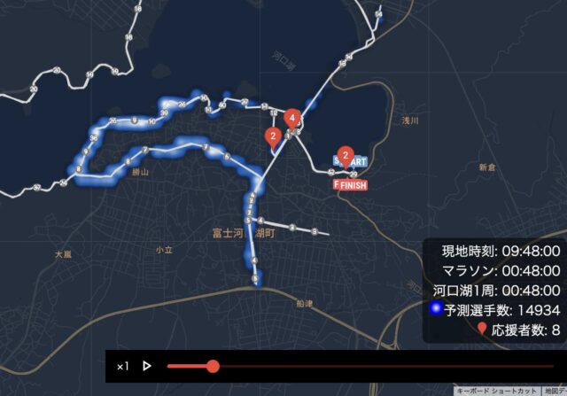 すれちがったランナーの数をカウントする新サービス「応援カウンター」では、いつ、どこで応援する人が多いかを選手位置と合わせて可視化。 ※参考画面は青色が選手、赤色が応援カウンター利用者数です。
