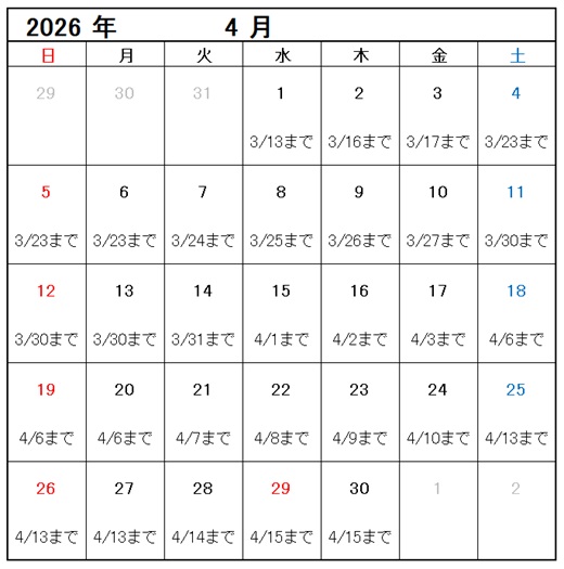 ※長期休暇等の場合、休み明け3営業日についても提出締切は12営業日前となります